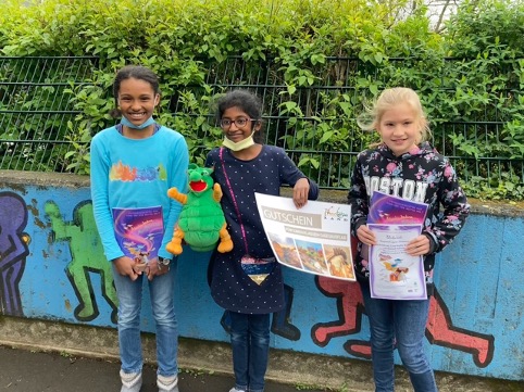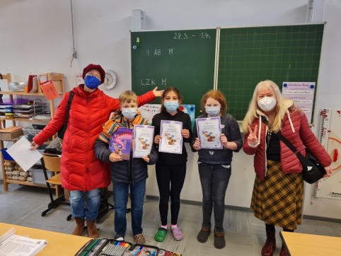 Einen besonderen Besuch der Frauen gab es in der Klasse 4a, denn Ileni, Lina und Hannah haben auch ihre Urkunden erhalten. Aber das tolle für die Klasse ist, dass sie einen Preis gewonnen haben, der heute vergeben wurde: Die Klasse erhält einen Gutschein für einen Ausflug ins Phantasialand!