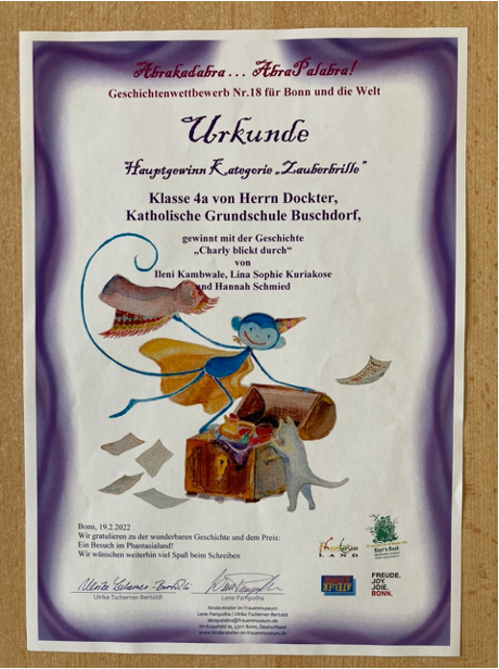 Heute sollten wir die Urkunde für unsere Teilnahme am Wettbewerb erhalten.