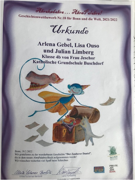 Wir hatten gerade Religion, als plötzlich der Lehrer der Klasse 4a hereinkam und mit unserer Religionslehrerin kurz sprach. Keine fünf Minuten später kamen zwei Frauen vom Frauenmuseum herein. Sie fragten, ob die drei Kinder, die die Geschichte „Der Zauberer Daniel“ geschrieben haben, in der Schule seien. Die drei Kinder, Arlena ,Lisa und Julian aus der Klassse 4b sagten, wie aus einem Mund, „Ja“!
